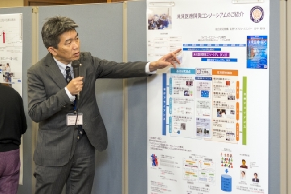 第二部の情報交換会では、本学の取り組みをポスター発表という形で、大学院医歯学総合研究科眼科学分野 大野京子教授より2019年11月に本格稼働した『先端近視センター』について紹介があり、疾患バイオリソースセンター 田中敏博教授より2018年12月に設置された『未来医療開発コンソーシアム』について紹介がありました。どちらの発表とも記者からの関心は高く、記者懇談会の終了後も質問が途絶えませんでした。